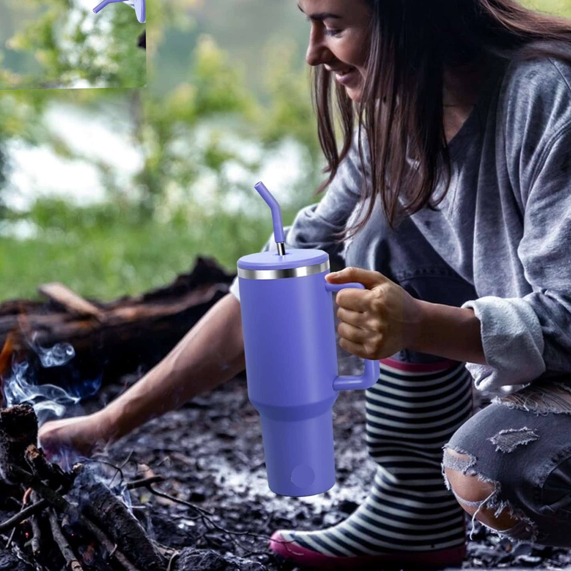 Designed with convenience in mind, the tumbler boasts a cup holder-friendly base measuring just 2.9 inches, ensuring a perfect fit in most car cup holders. The comfortable handle makes it easy to carry during your daily commute or on any adventure, providing a secure grip and effortless portability.
