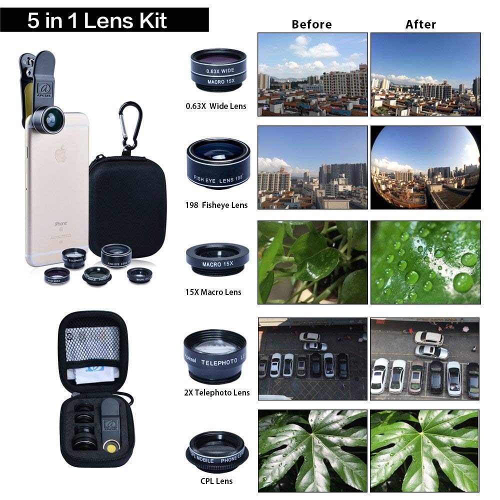 - 5-in-1 DETACHABLE LENS FOR CELLPHONE AND YOUR TABLETS – INCLUDES – 198 DEGREE FISHEYE LENS, 0.63 WIDE ANGLE LENS, 15X MACRO LENS, 2X TELEPHOTO LENS, CPL LENS. You can enjoy to take more great photos.