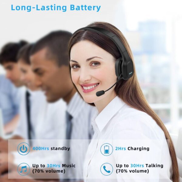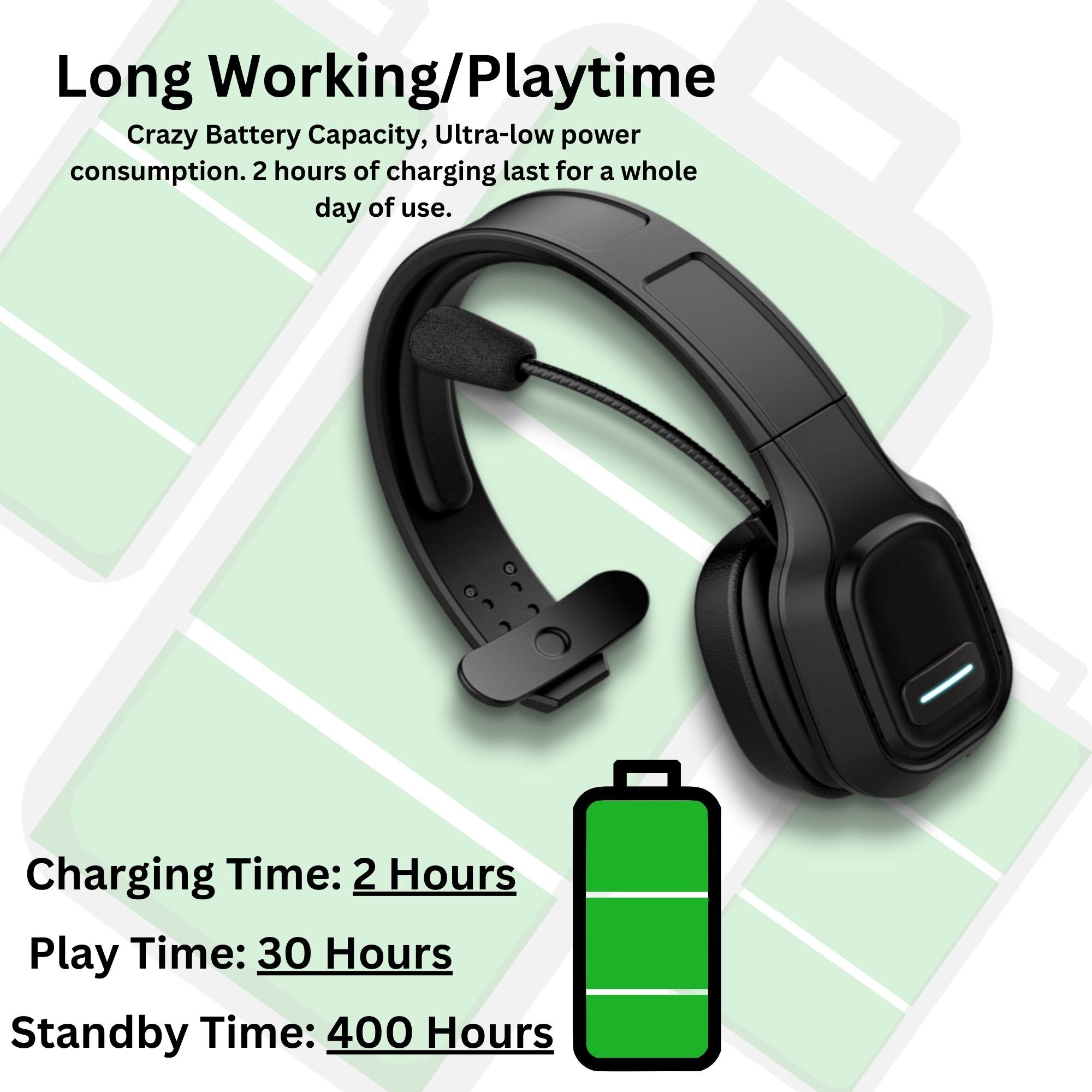 LONG PLAY/USE TIME: We packed a lot of battery power into this bluetooth wireless headset to support up to 30 hours of talk time and about 400 hours of standby time. A full day battery life use on less than 2 hours of charge.